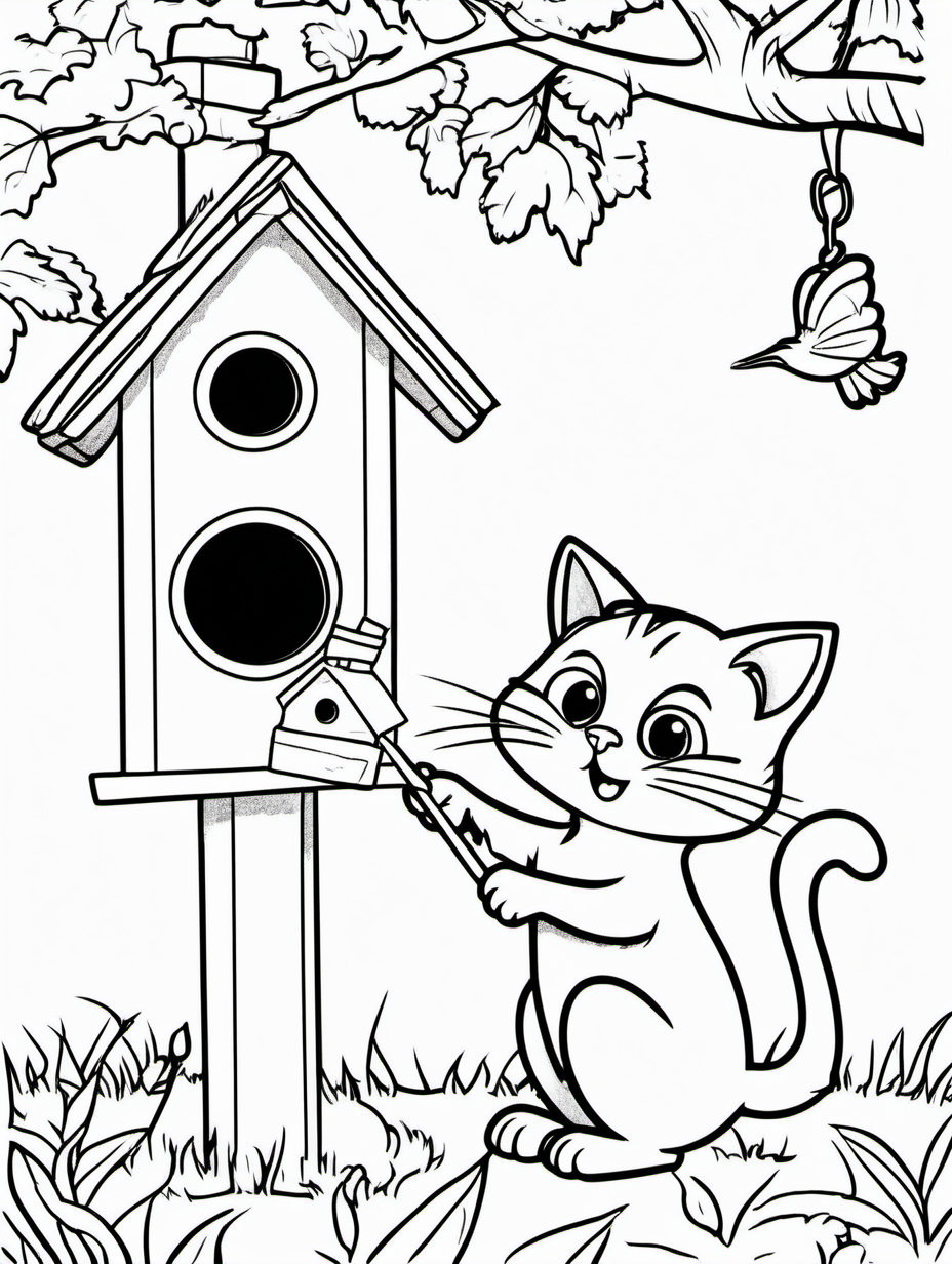 Cartoon Cat Trying to Reach a Birdhouse Coloring Page1