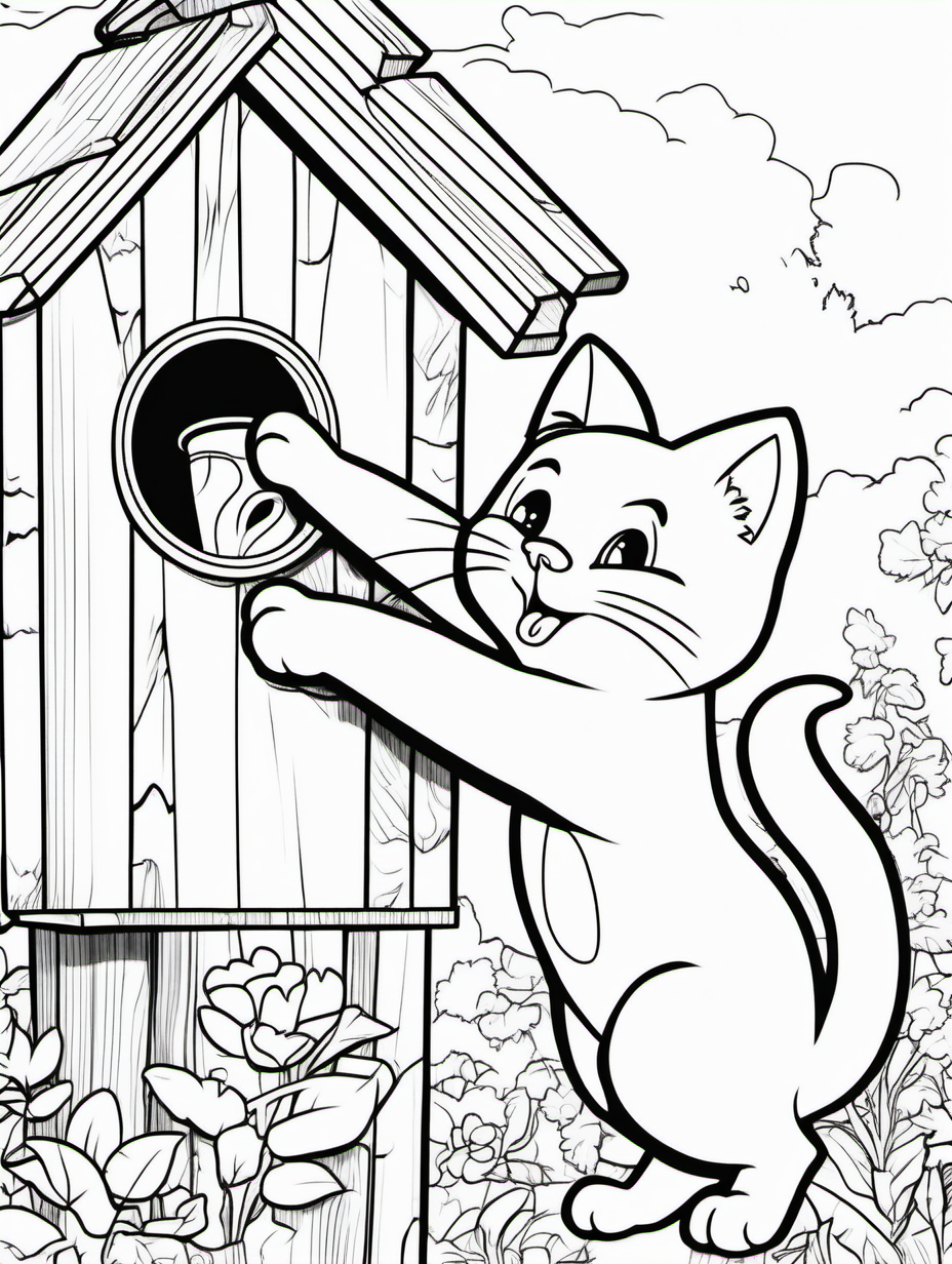 Cartoon Cat Trying to Reach a Birdhouse Coloring Page2