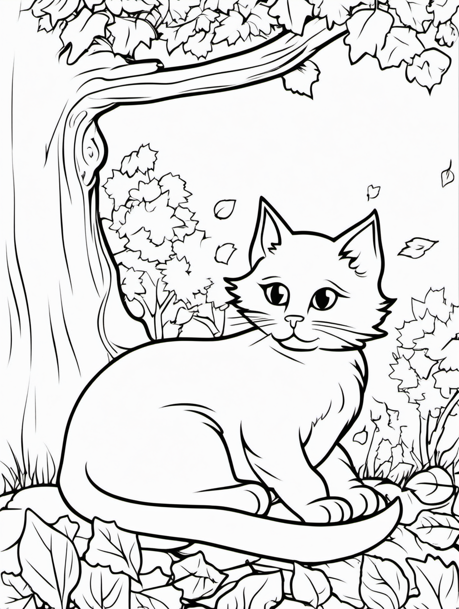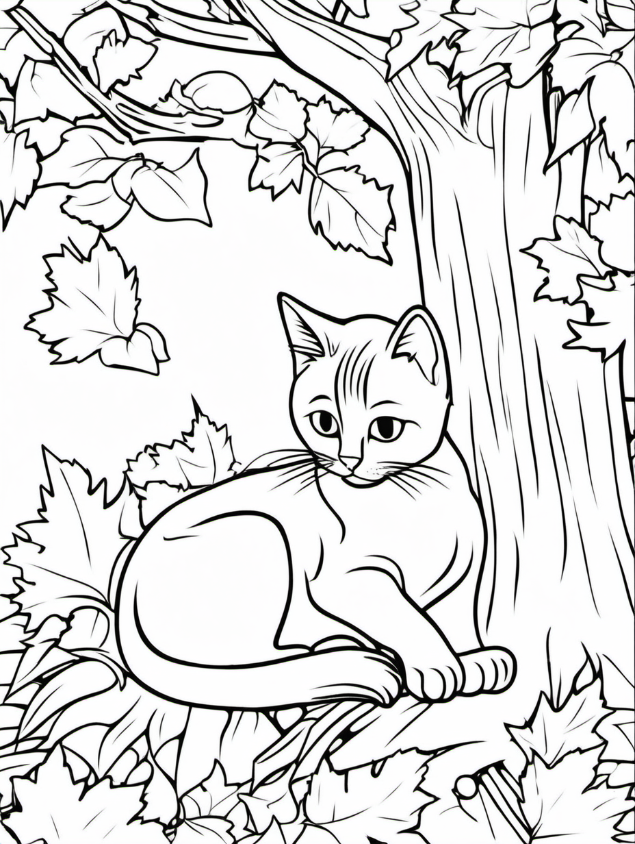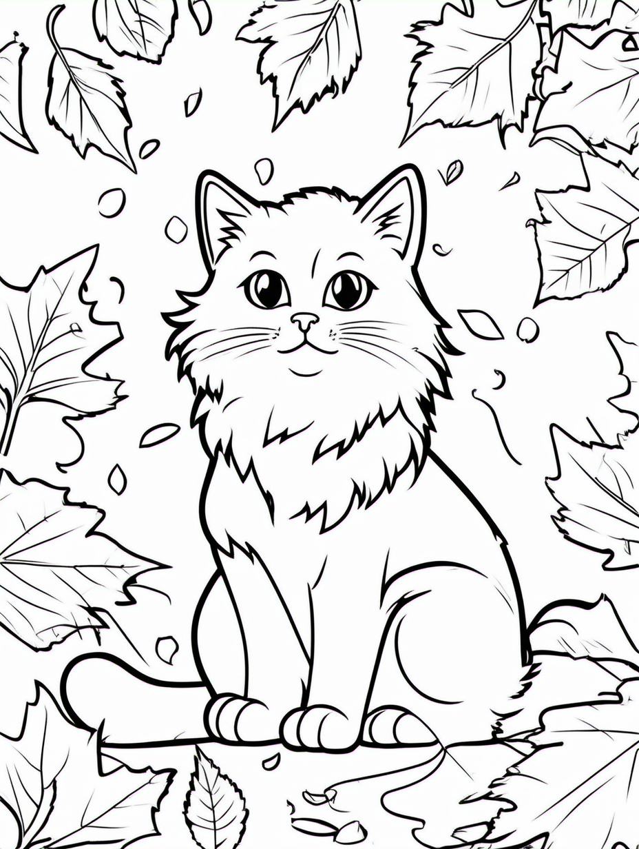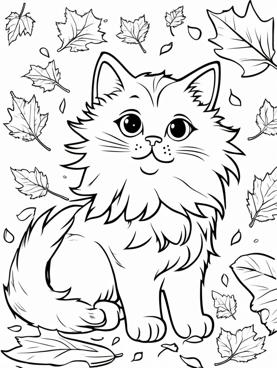 Fluffy Cat Playing with Falling Leaves Coloring Activity1