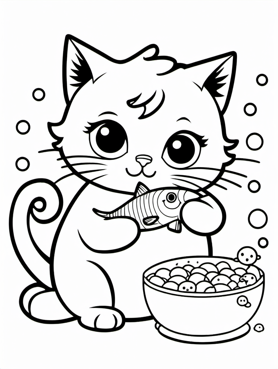 Cute Kawaii Cat Eating Fish Coloring Page for Kids1