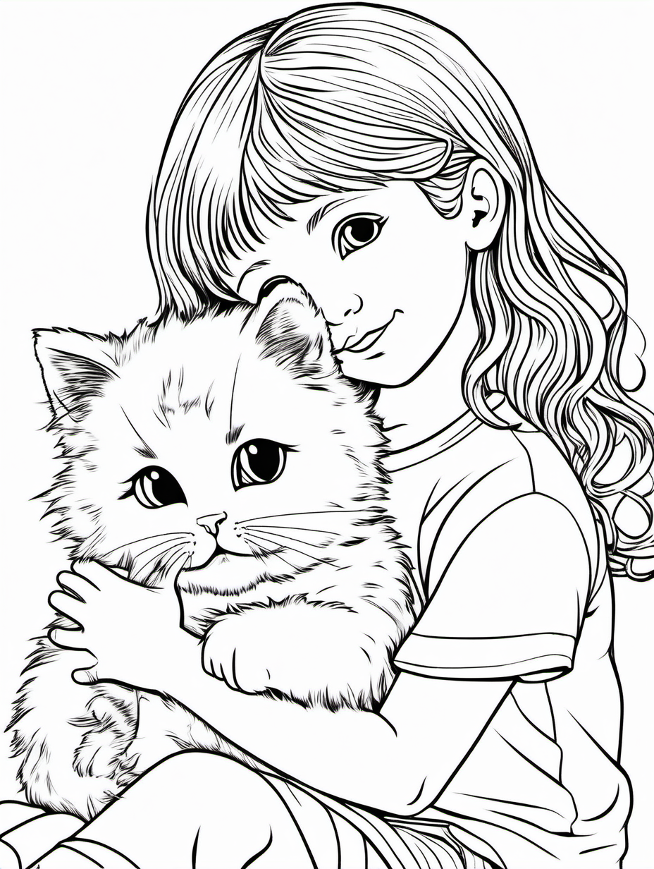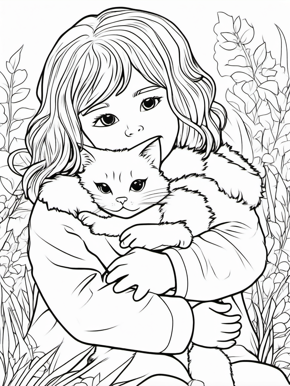Young Child Cuddling a Fluffy Cat Coloring Page1